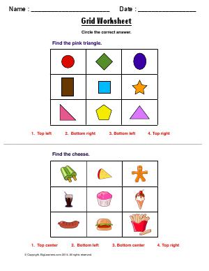 Children will find the location of a shape and an object on a 3 X 3 grid.