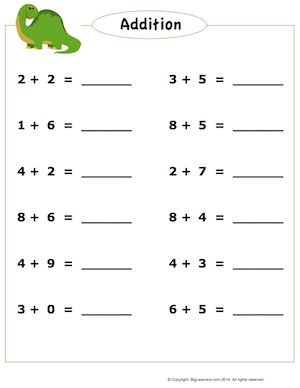 This single digit addition worksheet allows children to practice addition in a horizontal format.