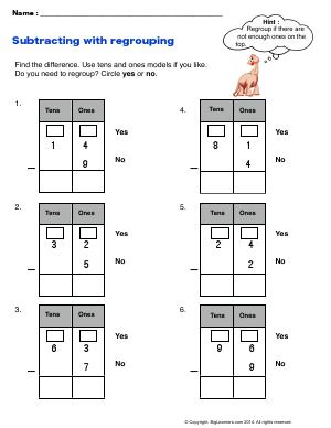 Subtract one digit number from a two digit number. Do you need to regroup? Circle yes or no.
