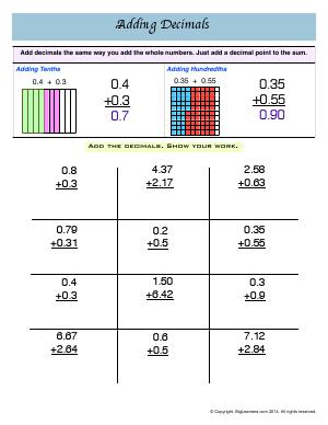 Here is a collection of our printable worksheets for topic Add and Subtract Decimals of chapter Learn Decimals in section Fractions and Decimals.
