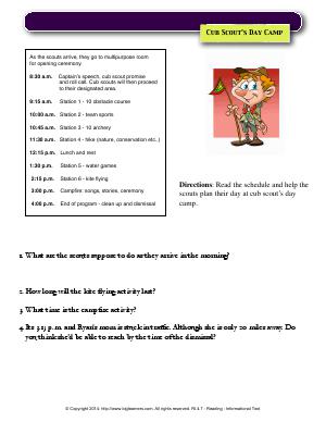 Read the schedule and help the scouts plan their day at cub scout’s day camp.